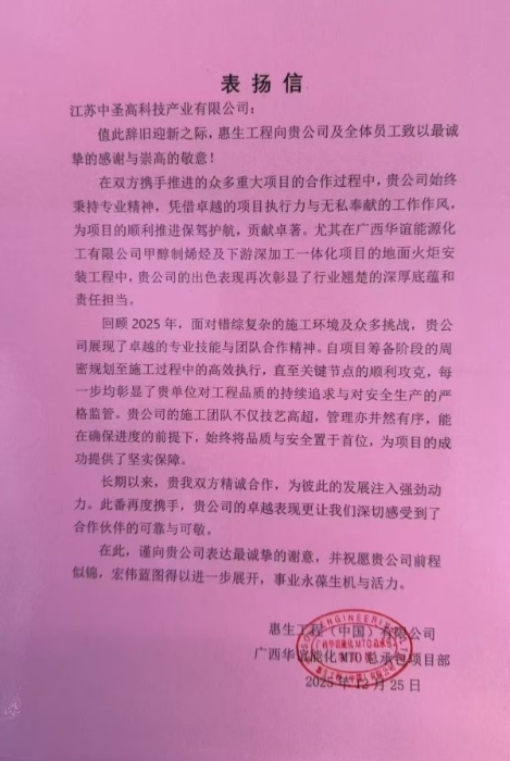惠生工程(中国)有限公司、广西华谊能源化工有限公司MTO总承包项目部向中圣高科公司颁发表扬信,充分肯定其在项目建设过程中的技术能力、执行效率与协作精神,称赞中圣高科为“可靠可敬的合作伙伴”。
