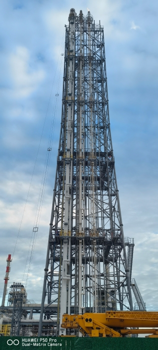 该项目是公司与万华化学首次在火炬系统工程领域的合作。火炬系统为可拆式高架结构,总高度95米,设计承担生产装置异常工况下的紧急排放与燃烧处理功能,是项目关键安全设施之一。项目建设需在前端工艺装置不间断运行、原有火炬系统持续投用的严苛约束下推进,对空间协调、接口匹配、风险隔离及施工精度提出极高要求。